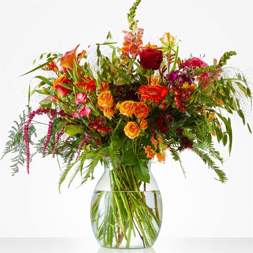 De warme kleuren van dit boeket komen je tegemoet! Een boeket dat echt binnenkomt; een ware lust voor het oog. Bestel er een passende vaas bij en je cadeau is compleet. (exc. vaas) Het geleverde boeket wijkt af van de foto aangezien bloemen natuurproducten zijn.