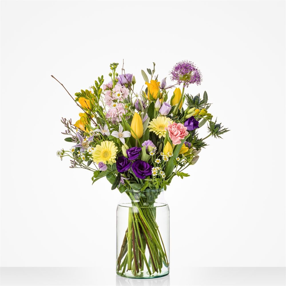 Geef dit prachtige boeket cadeau en creëer een onvergetelijke Paassfeer! Met zorg samengesteld in lila, roze en paarse tinten. Een stijlvol geschenk om je geliefden te verrassen. Maak het compleet en voeg een bijpassende vaas toe voor een perfecte present