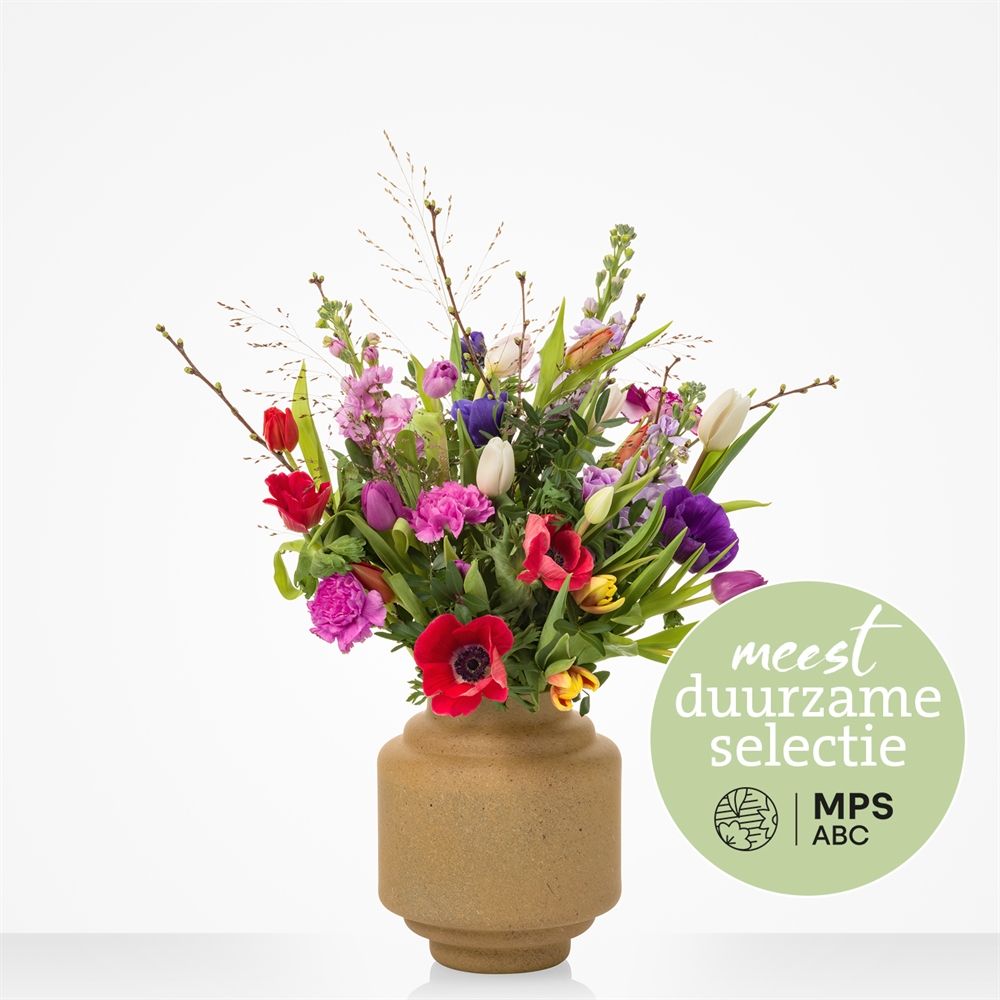 Breng de lente in huis met dit prachtige voorjaarsboeket. Onze bloemist Dennis van Bloem & Plant by Dennis Kuijlaars in Breda heeft speciaal voor het voorjaar een kleurrijk voorjaarsboeket samengesteld. Het Groen Gekeurd voorjaarsboeket is zorgvuldig samengesteld met duurzame bloemen en straalt vrolijkheid uit. Laat je huis opfleuren met deze frisse en levendige bloemen!