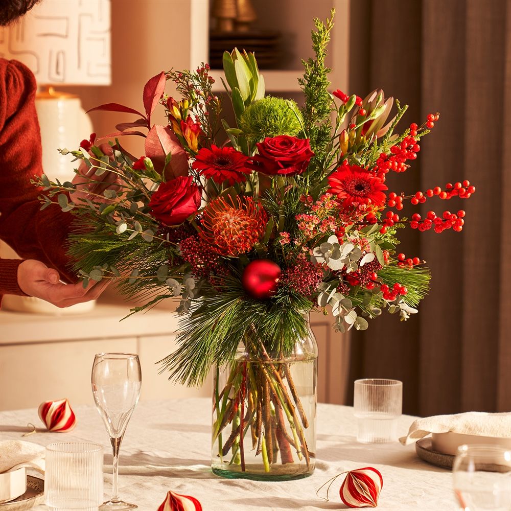 Dit prachtige en luxueuze kerstboeket is een absolute must-have en behoort tot onze favorieten. Exclusief vaas. Het geleverde boeket kan afwijken van de foto, omdat bloemen natuurproducten zijn.