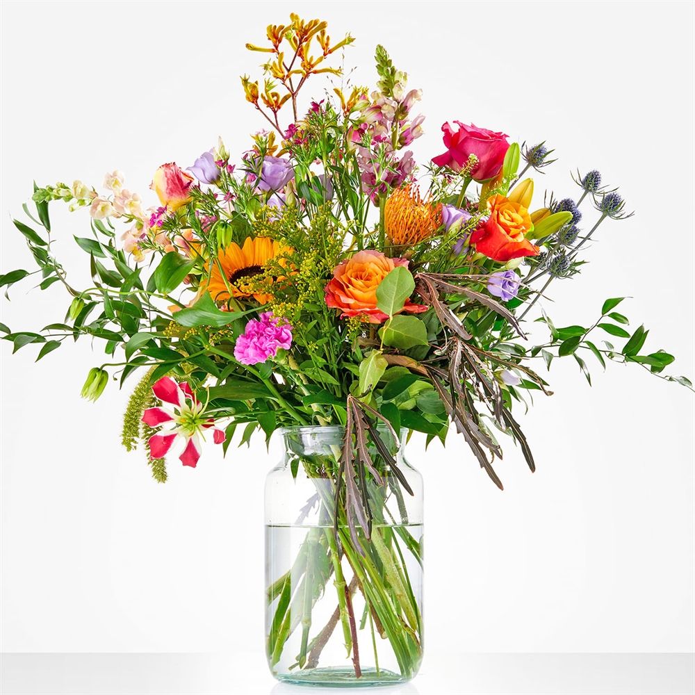 Ervaar het geluk van een plukboeket. Dit prachtige boeket straalt door de diverse seizoensbloemen in verschillende kleuren. Van dit boeket wordt iedereen vrolijk. Tip: bestel een bijpassende glazen vaas. De perfecte match voor dit prachtige boeket. Al on Het geleverde boeket wijkt af van de foto aangezien bloemen natuurproducten zijn.