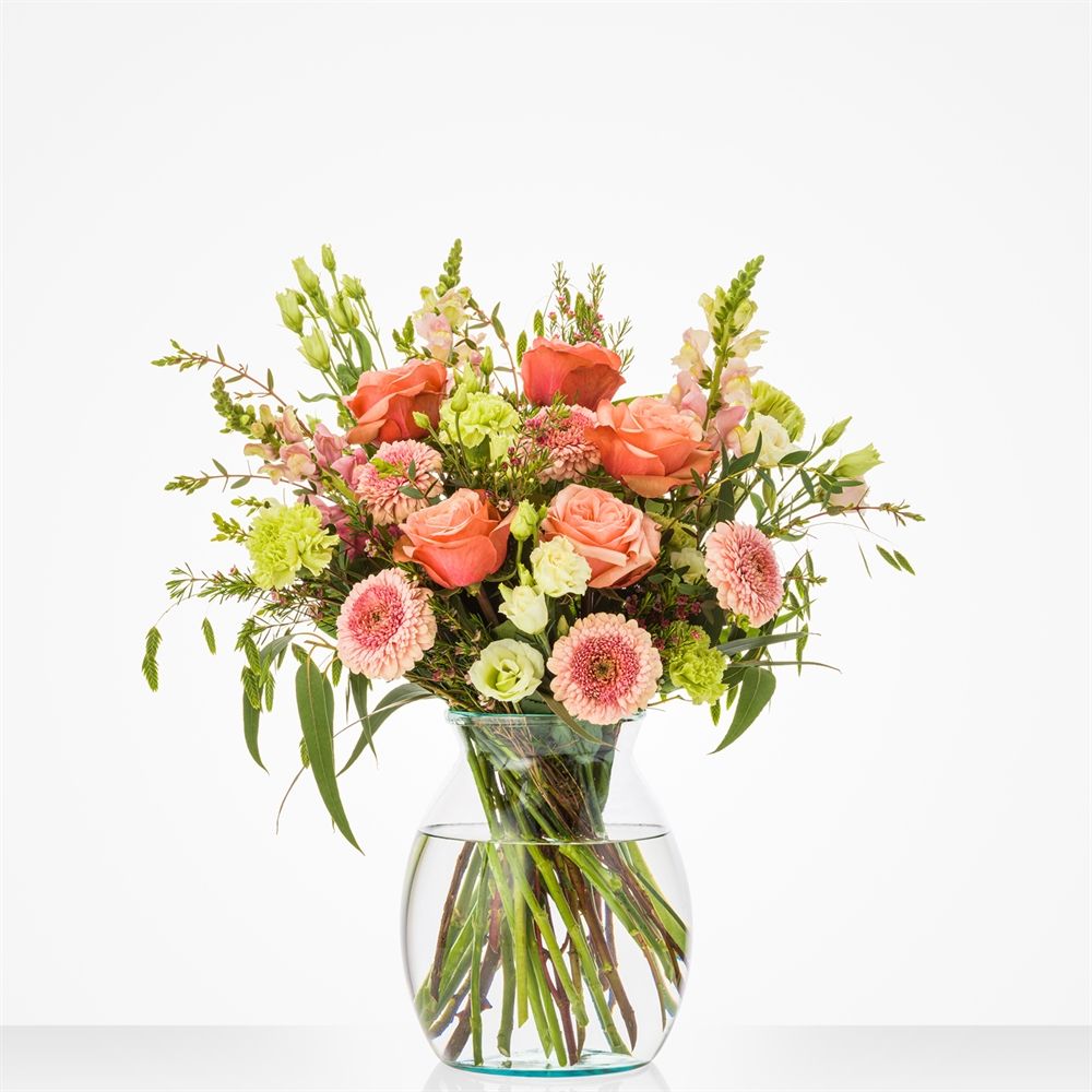 Ben je op zoek naar een betoverend cadeau? Laat je verrassen door onze favoriete boeketten! Dit prachtige arrangement straalt luxe uit met roze rozen, gerbera's en elegante Eustoma. Een stijlvol gebaar waarmee je iemand onvergetelijk verrast. Laat de bloemen spreken en geef het perfecte geschenk van liefde en vreugde - bezorgd door heel Nederland.