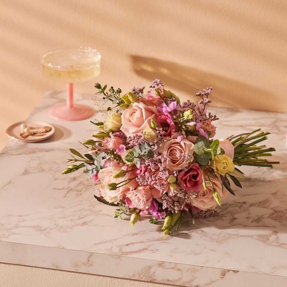 Het bruidsboeket Romantisch is een klassiek bruidsboeket in zachte tinten roze en speciaal samengesteld voor de mooiste dag van jullie leven. Dit verfijnde boeket is een prachtige combinatie van rozen, anjers, de phlox en limonium. Het resultaat is een tijdloos en elegant boeket en een tastbaar symbool van jullie liefde en een gelukkig leven samen. Het boeket wordt afgebonden met lint en wordt op water geleverd in een passende vaas, zodat de bloemen langer mooi blijven. Goed om te weten: Bestel jouw trouwbloemen minimaal 7 dagen voor de gewenste leverdatum om de bloemist de tijd te geven jouw bruidsboeket tot in perfectie samen te stellen.