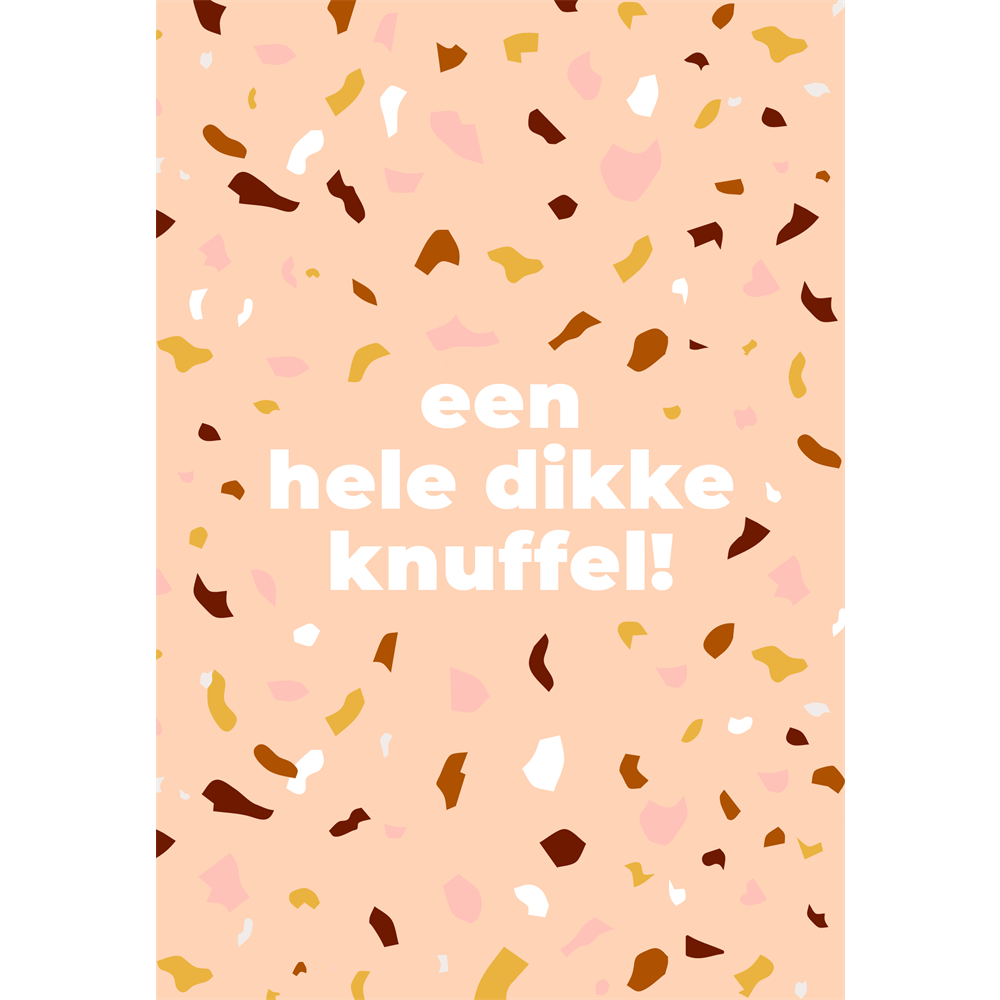 Wenskaart met confetti en de tekst een hele dikke knuffel groot