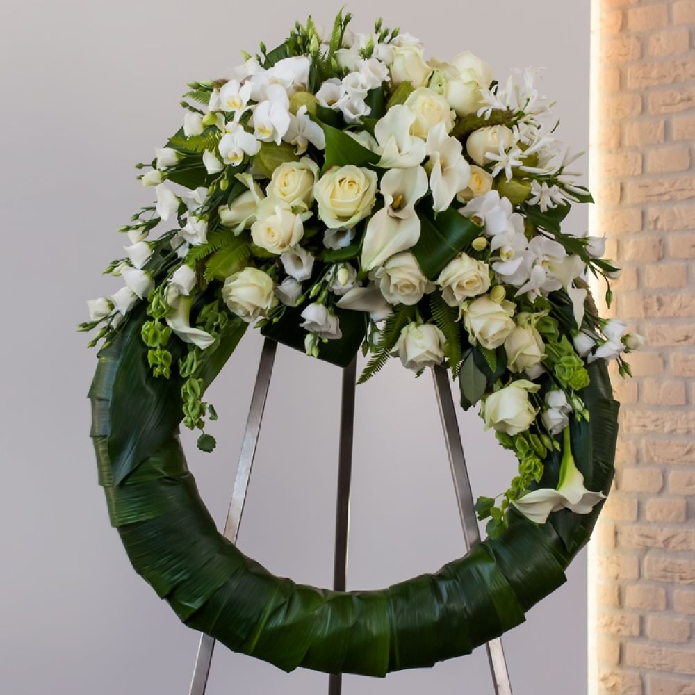 Traditionele krans met moderne toef van witte bloemen, incl. ondergrond, excl. lint en kransenstandaard