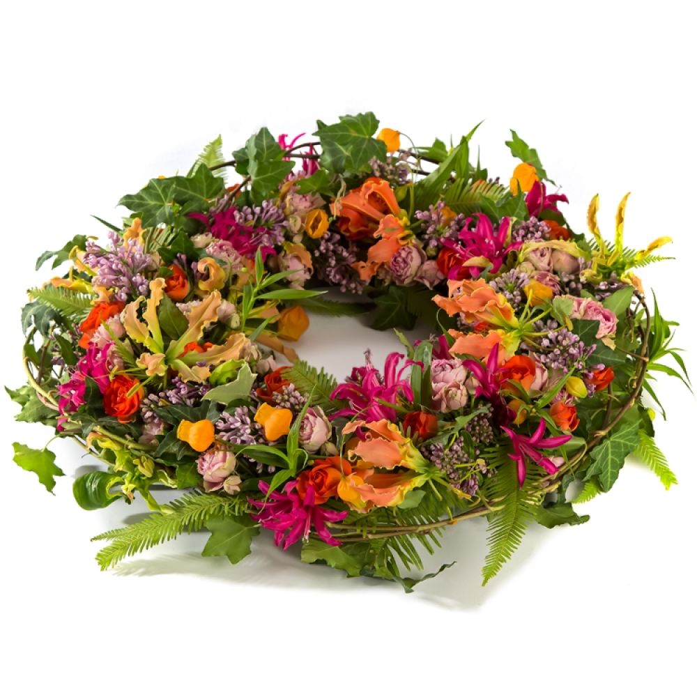 Deze veelgekleurde rouwkrans met veldboeketachtige schikking is zeer stijlvol. Incl. ondergrond, excl. lint