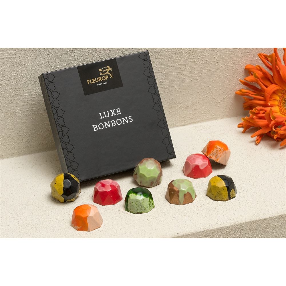 Deze luxe cadeaudoos is gevuld met een smaakvolle verrassing van 9 handgemaakte bonbons. De bonbons vormen het ultieme geschenk om samen met een boeket bloemen cadeau te geven. Elk van de 9 bonbons is gevuld met een romige en zachte pralinévulling, verkri