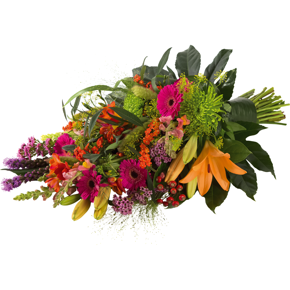 Prachtig gekleurd rouwboeket dat liggend wordt gepresenteerd, excl. ondergrond, vaas en lint.