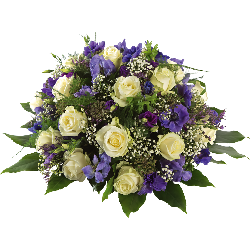 Romantische schikking in blauw/witte bloemen, excl. lint.
