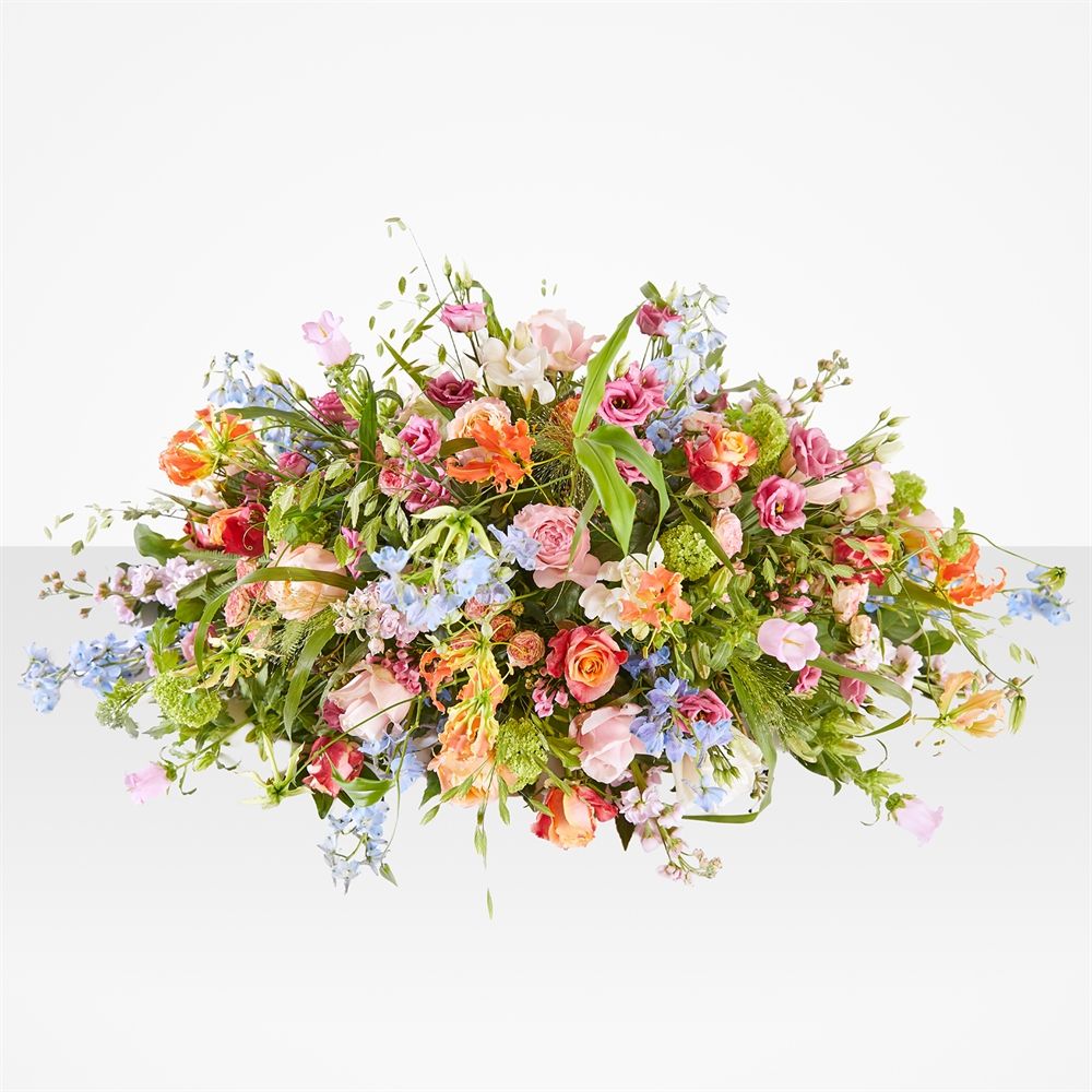 Creëer een warme sfeer met het ovale bloemstuk Bloemenpracht, een meesterwerk vol kleur en elegantie. De liefdevolle rouwstukken stralen rust uit met zachte bloemen in warme tinten. Laat je betoveren door de moderne en verfijnde stijl, perfect voor het geven van bloemen als uniek cadeau. Beleef de luxe van een prachtig boeket, bestel nu en verras iemand in heel Nederland.