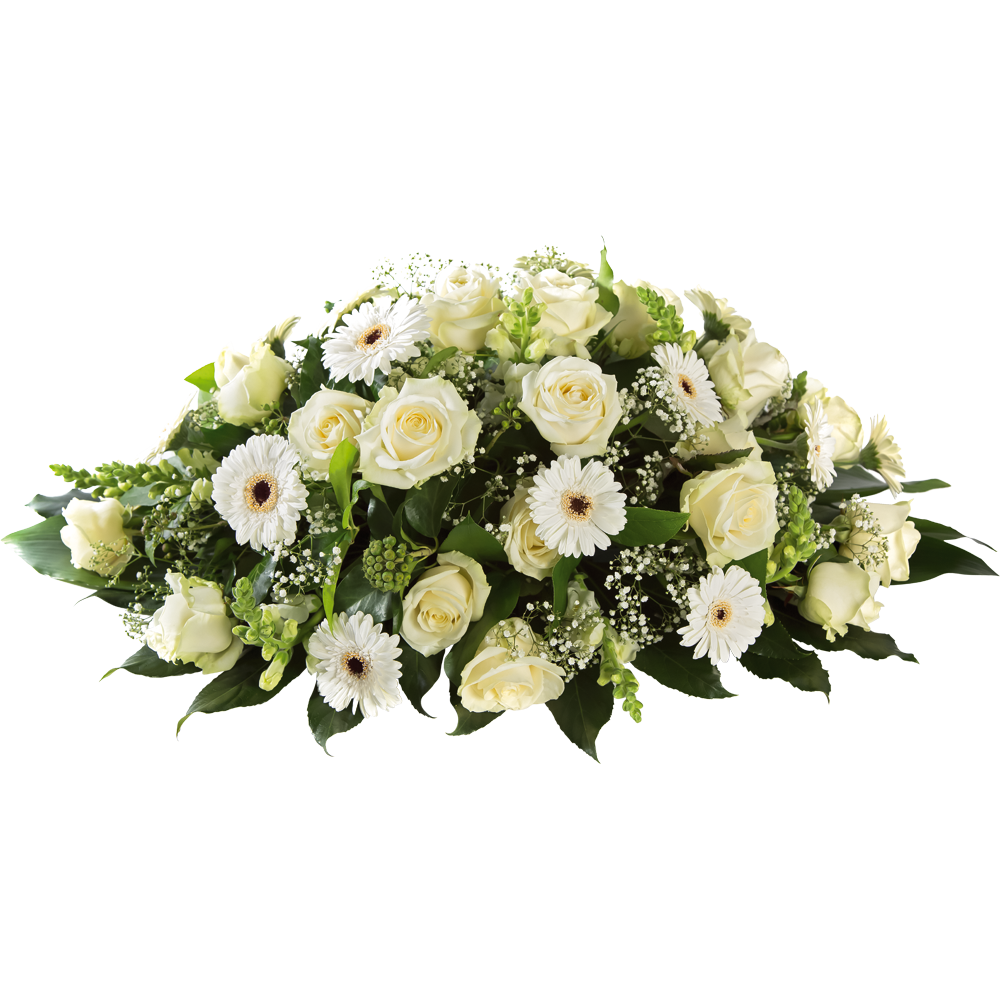 Roos, gerbera en gipskruid zijn in ovaalvorm opgestoken, excl. lint. - 60 cm - 70 cm - 80 cm