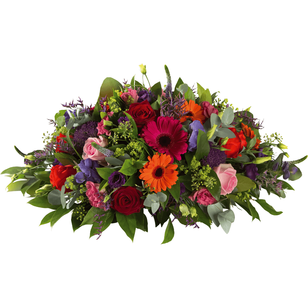 Diverse bloemen samengevoegd tot een kleurrijk ovaal arrangement. Excl. lint - 50 cm - 60 cm - 70 cm