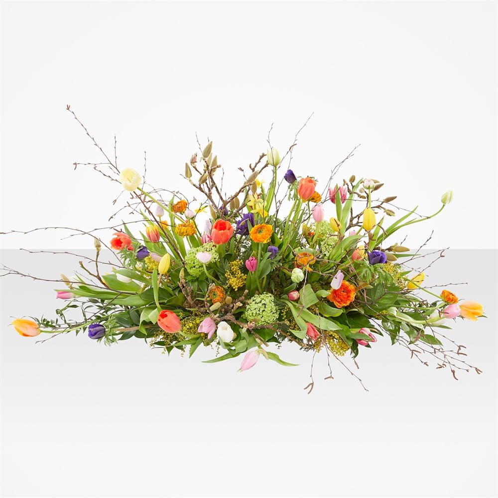 Ontdek onze betoverende ovale schoonheid Uit de bol, gevuld met prachtige seizoensbloemen die van januari tot april bloeien. Dit moderne kunstwerk in bonte kleuren straalt een unieke charme uit. Kies uit 50cm, 80cm of 100cm voor een groots gebaar vol emotie en warmte. Laat je geliefden verrassen met dit weelderige bloemstuk als betekenisvol geschenk, geleverd door het hele land.